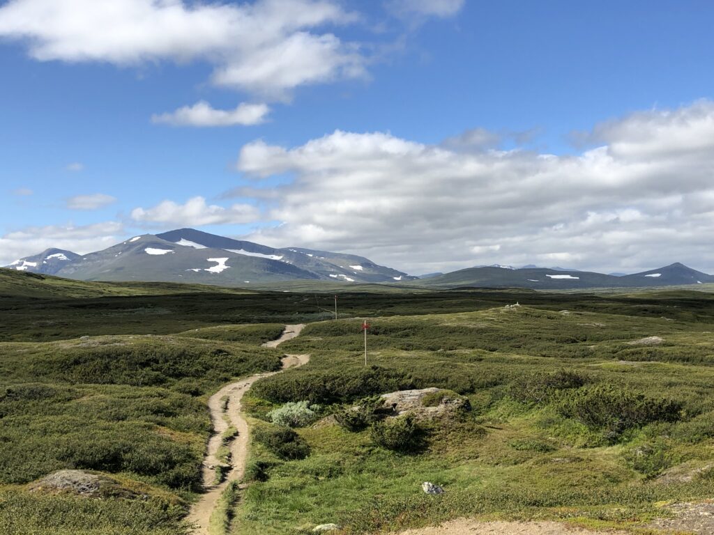 We hike in Funäsfjällen, a mountain region in the county of Härjedalen in northern Sweden. This is a landscape shaped by ice, wind, and time. Wide, open moors give way to lush valleys thick with wildflowers. Some of Sweden’s highest peaks south of the Arctic Circle rise here, with views that stretch for miles. And weaving through it all are rushing waterfalls and ice-cold mountain streams.